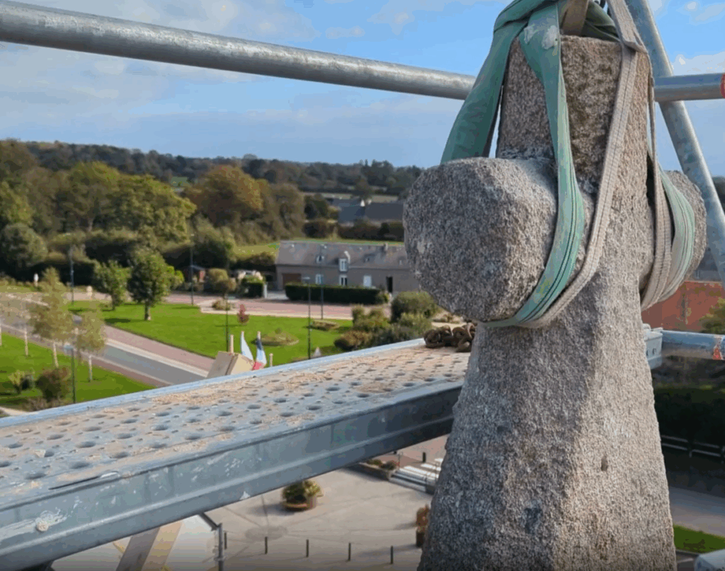 Dans le cadre de la restauration complète des façades et du clocher de l’église, nous avons taillé et posé une nouvelle croix en pierre au sommet.
